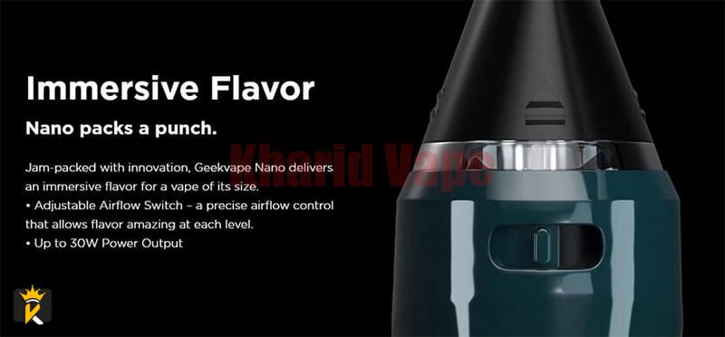 پاد ماد ایجیس نانو گیک ویپ GEEKVAPE Aegis Nano Pod Mod برای افرادی که به دنبال یک گزینه کوچک و شیک هستند که از MTL (از دهان به ریه) و RDTL (محدود شده مستقیم به ریه) برخوردار باشد فوق العاده است. به دلیل وجود سیم پیچ هوشمند، کیت تشخیص می دهد که بهتر است از کدام غلاف استفاده شود و سطح توان مناسب شما توسط آن انتخاب میشود. باتری ۸۰۰ میلی آمپری داخلی این دستگاه را تنها کافی است تا یک بار در روز به صورت کامل شارژ کنید تا دیگر نیازی به شارژ مجدد در طول روز نداشته باشید.